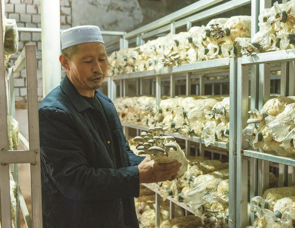 海原县三河镇富陵村村民马玉武在自家的蘑菇房里查看蘑菇的长势。张旭 摄