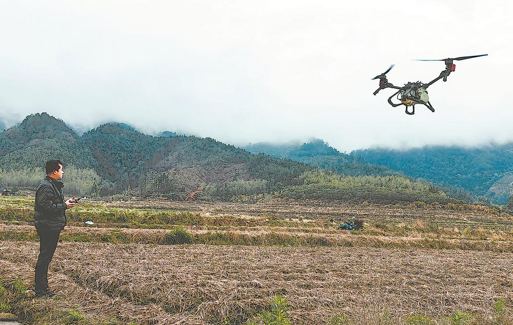 日前,在将乐县白莲镇大里村,永兴农业专业合作社社员正操作无人机进行田间作业。