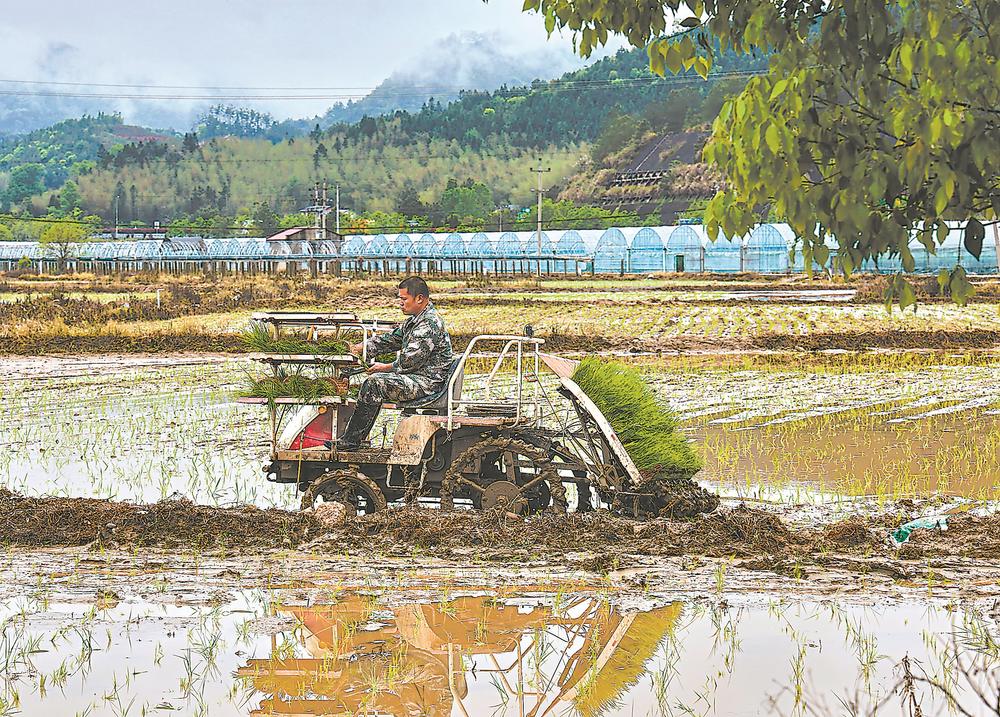 农机耕种,让土地“活”起来。山垄田以前主要靠人工耕作,如今镇上多是留守老人,“不好耕、没人耕”是田地撂荒的一大原因。“大型机器不好进入的地块可以用无人机飞播,机插秧能提升30%产量。智能化设备为活用土地带来新对策。”杨勇说。