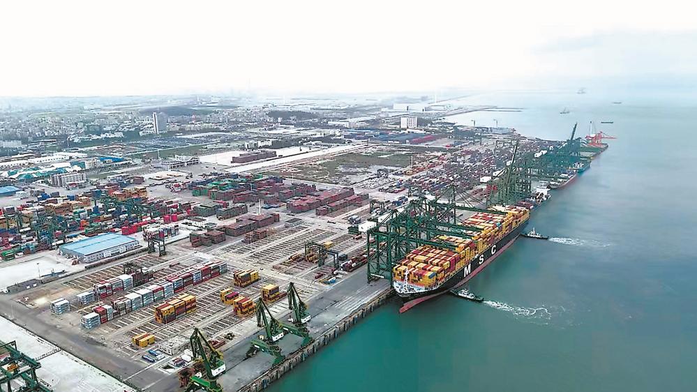 7月20日,15万吨级超大型集装箱船“地中海索尼亚”轮靠泊福州港江阴港区,带来单航次超万箱吞吐增量。薛有雄 摄