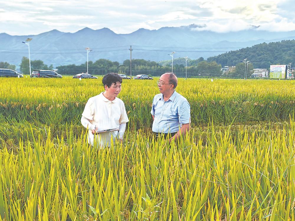 谢华安(右)和郑莉在浦城县石陂镇再生稻示范片察看头季长势。