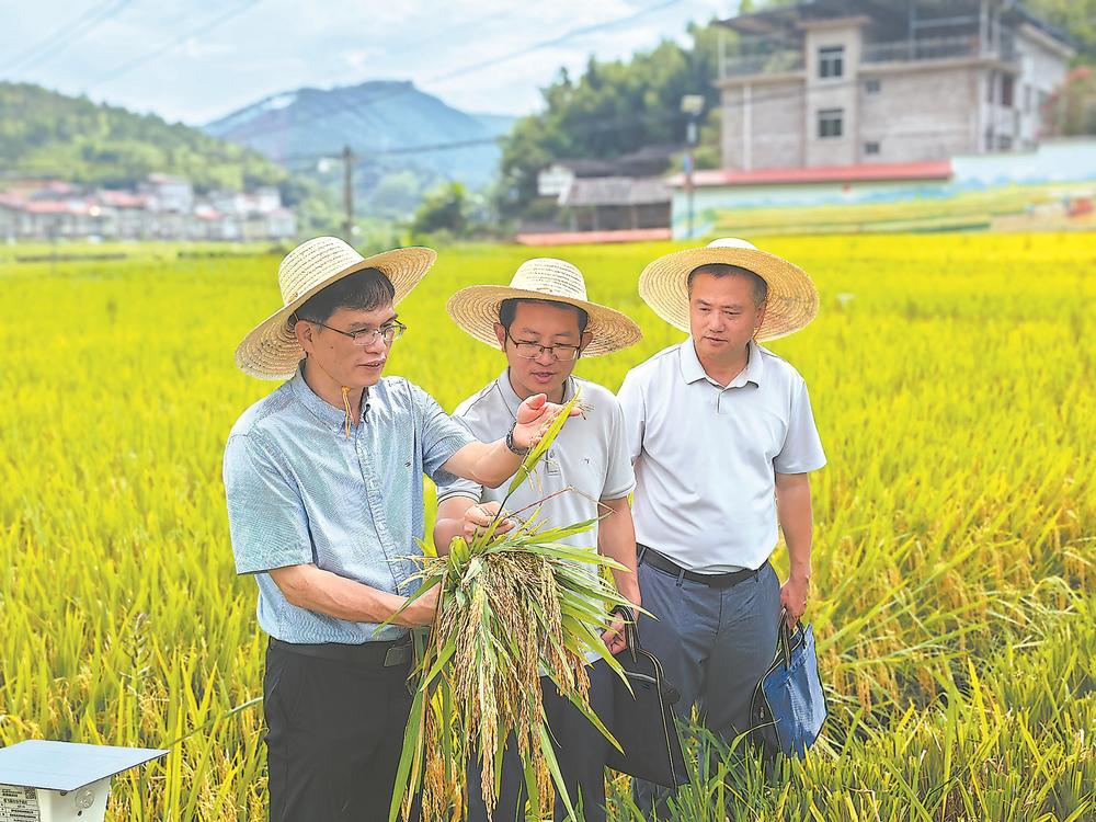 在尤溪县西城镇麻洋村,水稻专家在察看再生稻头季长势。