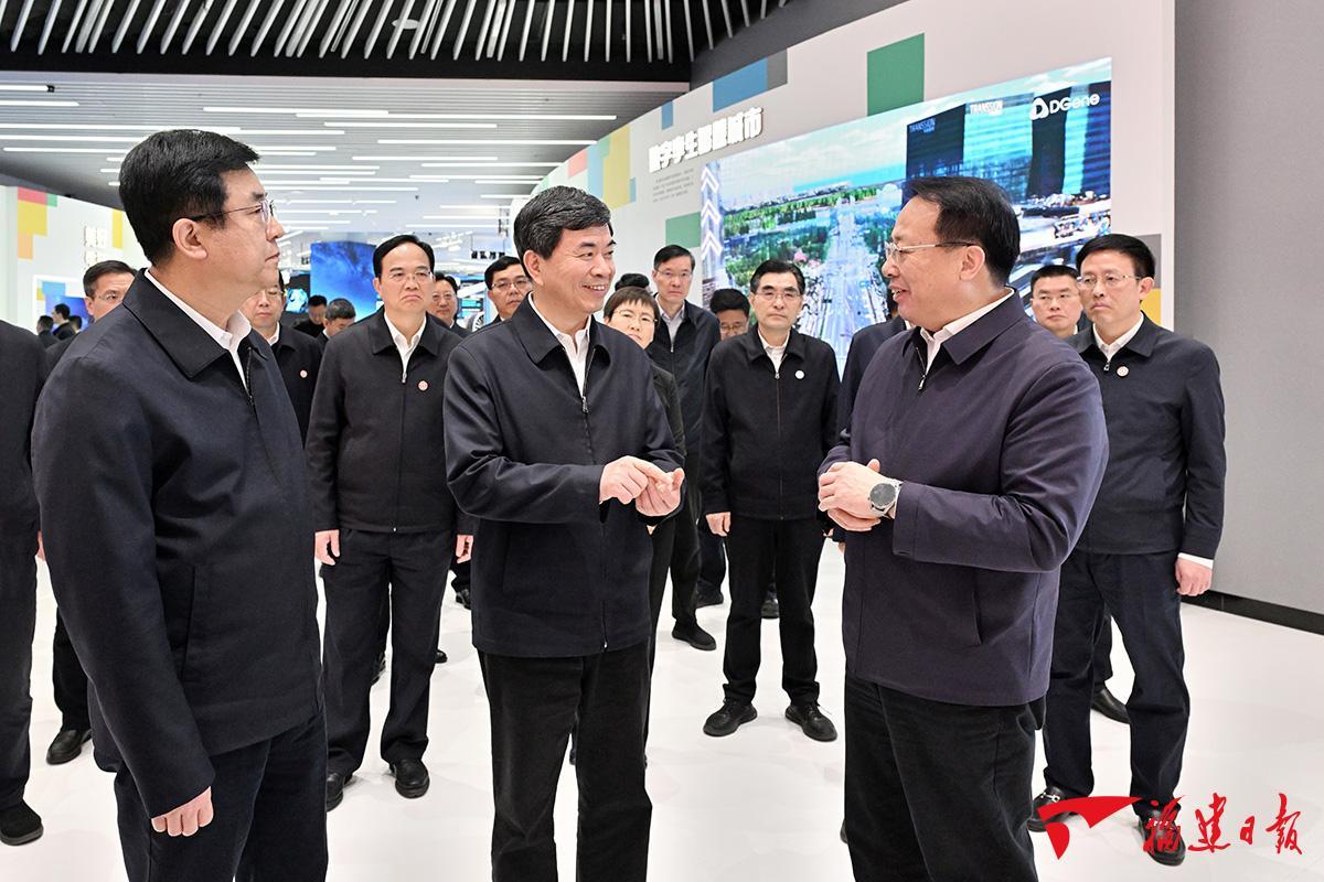 陈吉宁说,当前,我们正在深入学习贯彻习近平总书记考察上海重要讲话精神,聚焦建设“五个中心”重要使命,加快建成具有世界影响力的社会主义现代化国际大都市,在推进中国式现代化中充分发挥龙头带动和示范引领作用。沪闽两地有很多相似之处,都承担着国家重大战略任务。将进一步加强对接,共同谱写沪闽合作新篇章。在深化高水平开放上携手共进,在服务共建“一带一路”上增强联动,打造国际合作发展新优势。在构建现代化产业体系上加强协同,优化产业对接机制,携手培育发展新质生产力。在推进绿色低碳发展上同向发力,在构建绿色低碳供应链体系上深化合作,携手推进美丽中国建设。在传承红色基因上拉紧纽带,加强红色资源整合,弘扬红色文化、讲好红色故事。上海将按照党中央部署,与福建省、三明市一道,加快探索区域协同发展新模式,打造对口合作新样板。