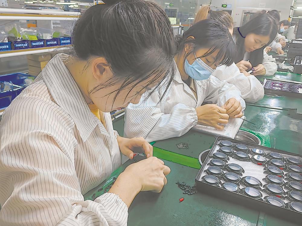恒丽迪卡侬精益生产车间内,员工在组装手表。