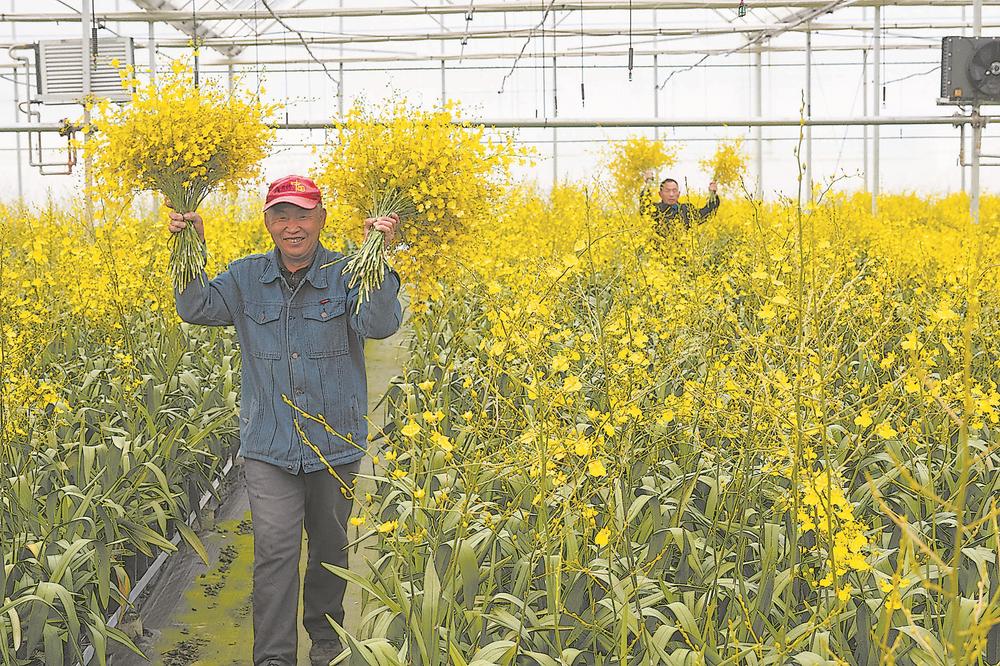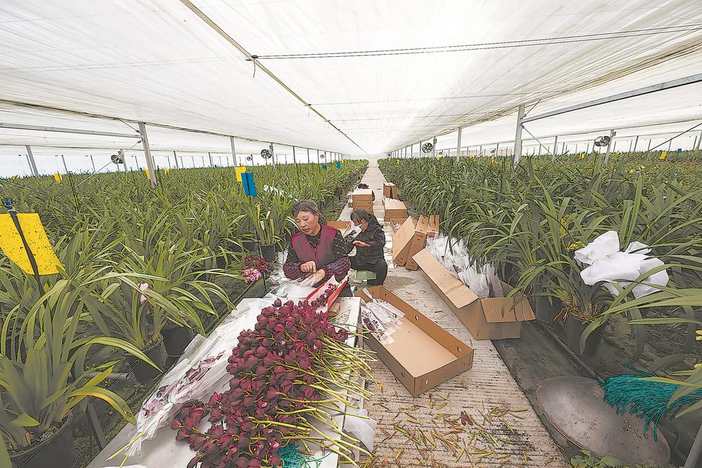 春节前夕,一个大花蕙兰种植基地,花农将大花蕙兰鲜切花套上袋子,销往外地。