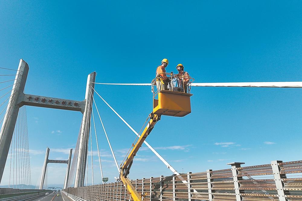 桥梁工搭乘施工平台在空中展开作业。通讯员 易威 摄