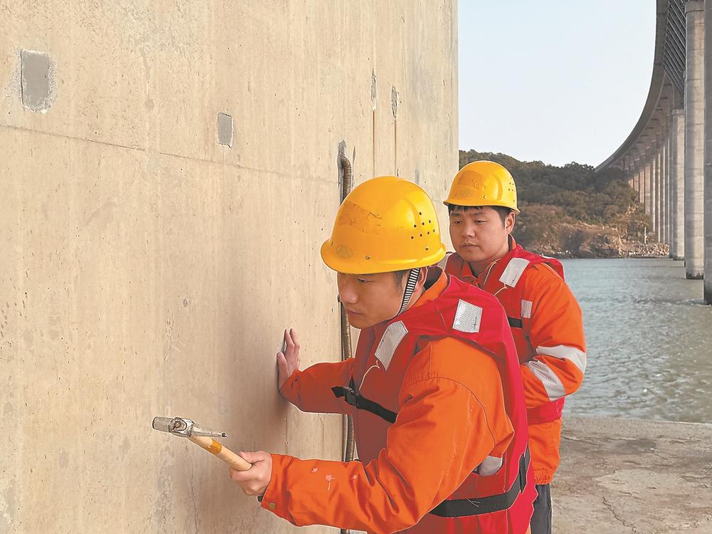 低头、弯腰、敲打……沿着承台,队员们半躬着背,手举着特制的检测锤,叮叮当当地敲击墙面,仔细听其声音来判断各个部件是否完好。