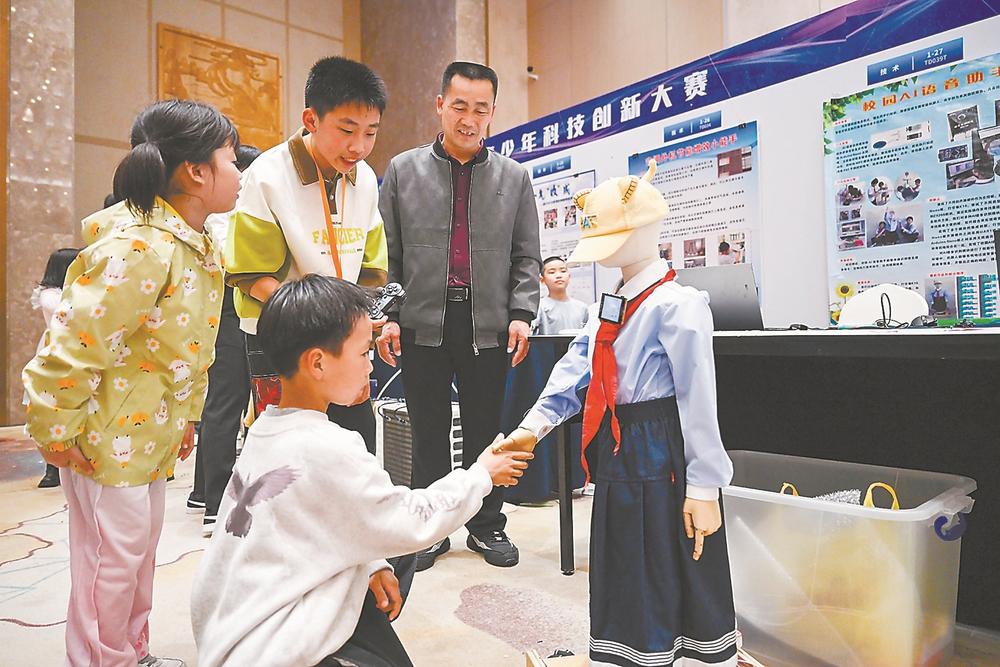 前来参观的学生和校园AI语音助手“童童”互动。