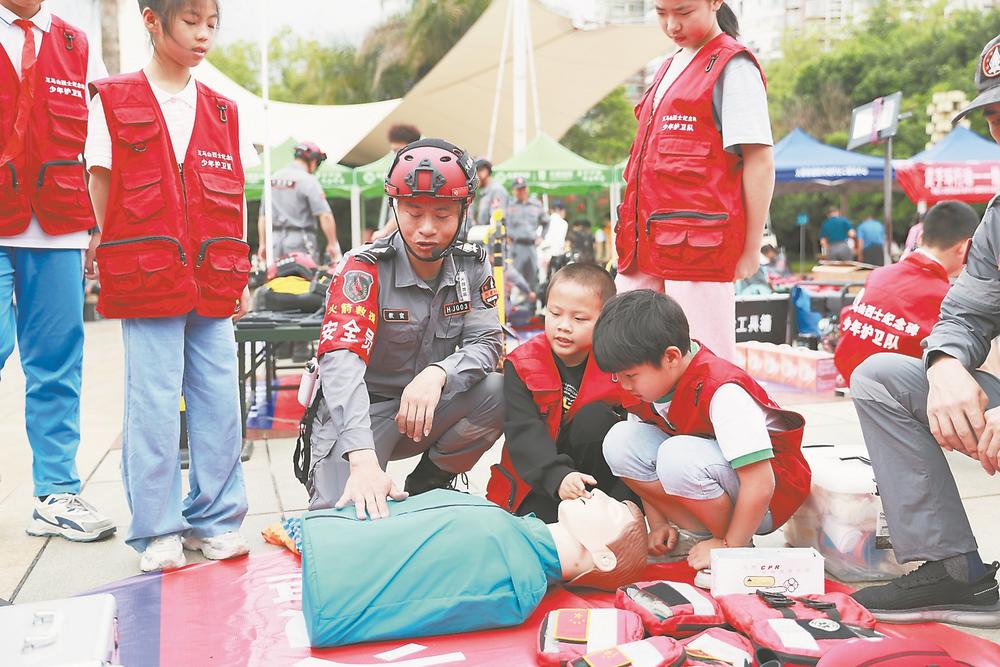 在将乐县古镛镇日照东门广场,火箭救援队队员为五马山少年护卫队的小朋友讲解应急救援知识。