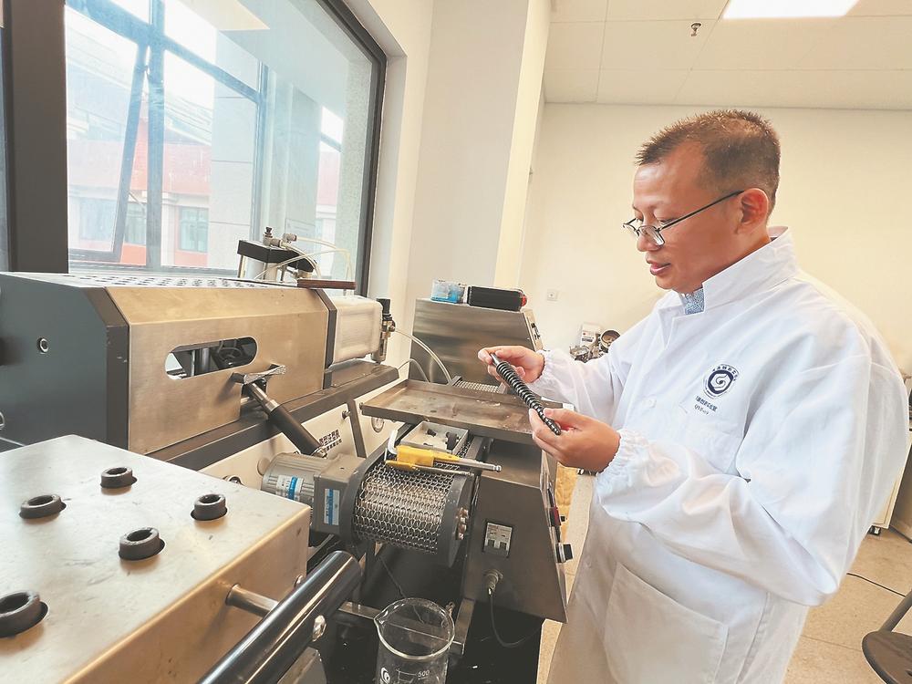 实验室的中试基地内,一场“材料对决”吸引了记者的目光:普通纤维遇强酸数秒炭化,而结构改性聚苯硫醚纤维在同样的液体里浸泡许久仍挺括;经1300摄氏度火焰喷射,纤维所制面料未熔未变形无滴漏。“这就是‘塑料黄金’,做消防服、飞机座椅都安全可靠。”蔡伟龙拿起团队研发的改性聚苯硫醚纤维介绍。