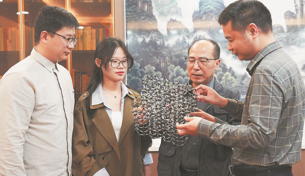 国家杰青、973项目首席科学家、清源创新实验室执行主任鲍晓军教授(右二)与实验室科研人员讨论分子筛中活性金属的落位情况。(受访单位供图)
