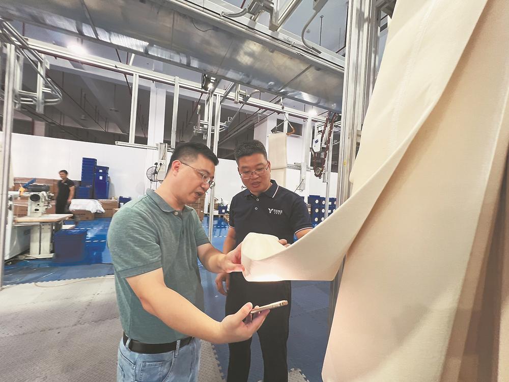 清源创新实验室在企业常驻科研人员王巍博士(左)与远致集团生产总监刘忠良(右)讨论P32纤维滤袋成品制作细节。记者 李珂 摄