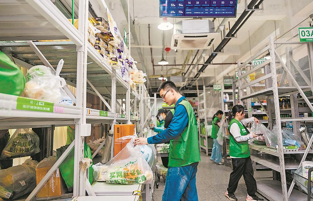 23日,福州朴朴公司一家前置仓内,拣货员穿梭在货架间,拿着塑料袋和随身携带的PDA终端机快速分拣商品。记者 施辰静 摄