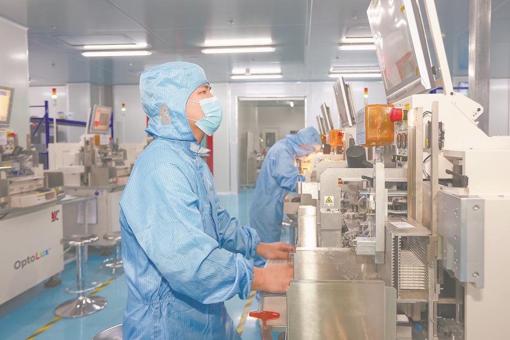 福建晶旭半导体科技有限公司生产车间内,工人在进行焊线操作。谢泽铧 摄