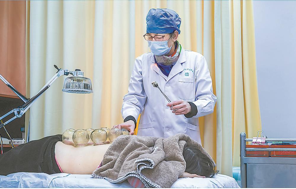 中医师庄仪为患者进行拔罐治疗。