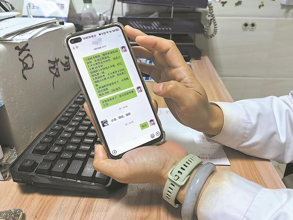 中医师为患者详细介绍中药熬制方法。