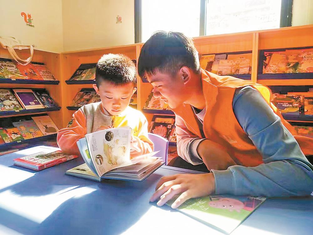 福州大学霞舒公益实践队队员和小朋友一起阅读。