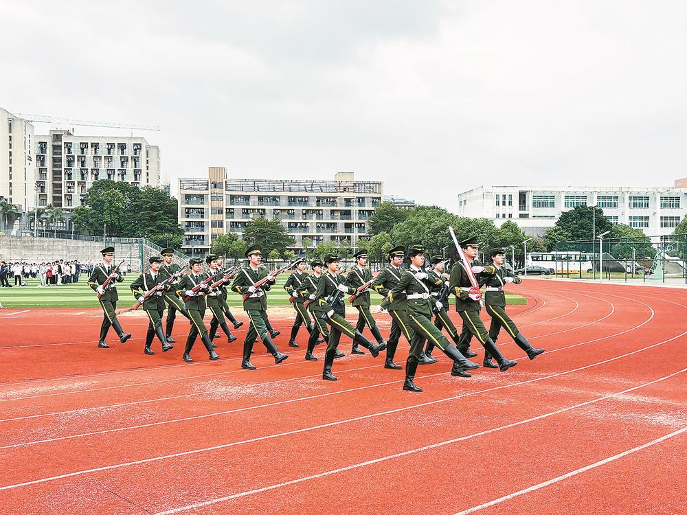 福州旅游职业中专学校的学生在国旗护卫队训练中学会团队精神。