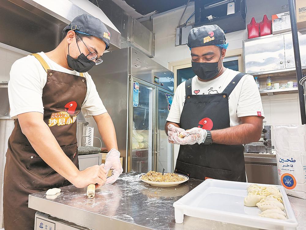 在沙特阿拉伯利雅得市中心的沙县小吃旗舰店内,外籍店员在包柳叶蒸饺。