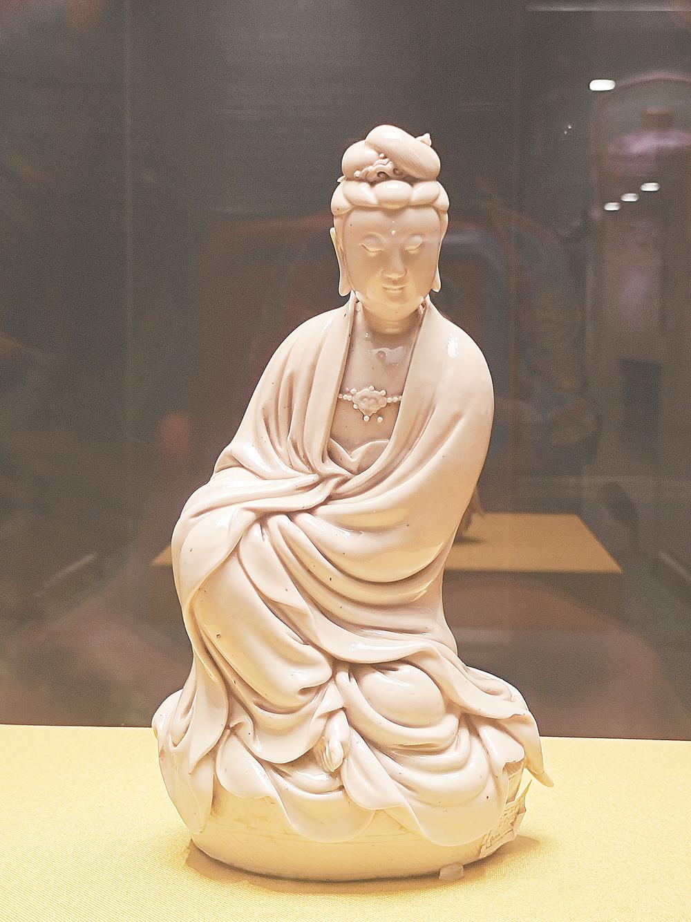 现场展出的何朝宗款德化窑白釉观音坐像。这件与福建相关的文物,是明代德化窑的经典作品。