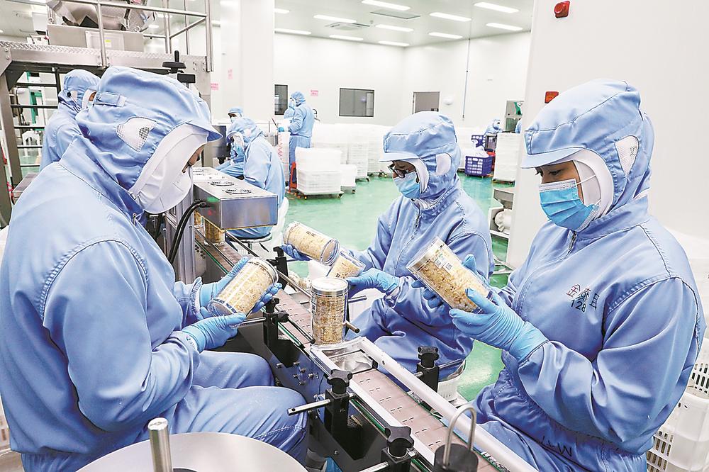 在古田一银耳现代化生产车间,工人在进行本草银耳产品的包装作业。蒋炜煌 摄