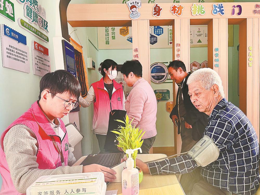 初冬时节,闽西小城长汀。冷风穿过街巷,但汀州镇中云丽景城的“健康驿站”里却暖意融融:几位老人围着“90后”医生刘朝烜等着量血压,另有几位站在“身材挑战门”前互相比拼。“张大爷,您体重超标了,得继续控油控盐啦!”刘朝烜提醒道。