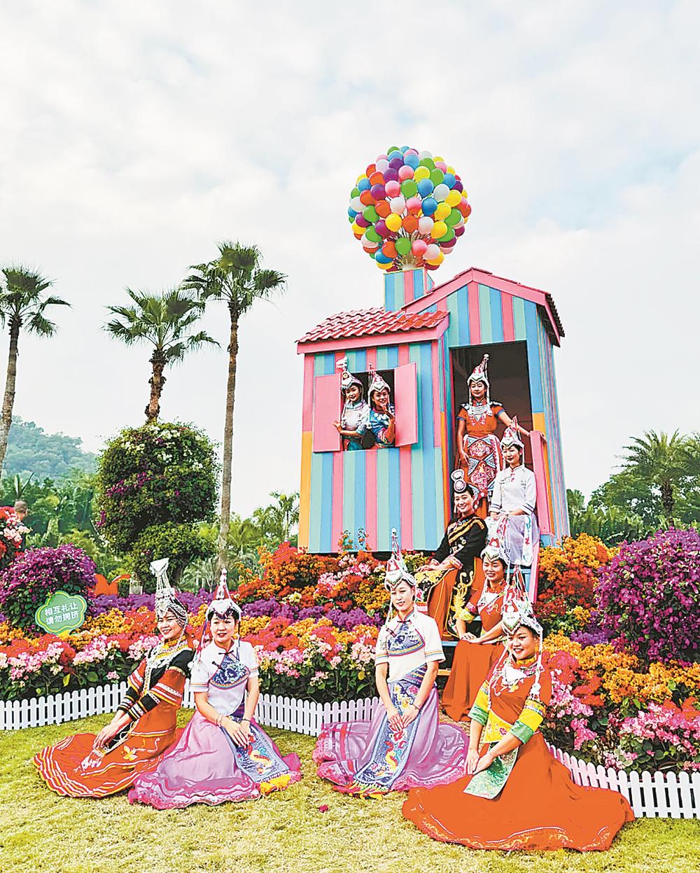 身着高山族服饰的姑娘在特色花艺展区合影 李林 摄