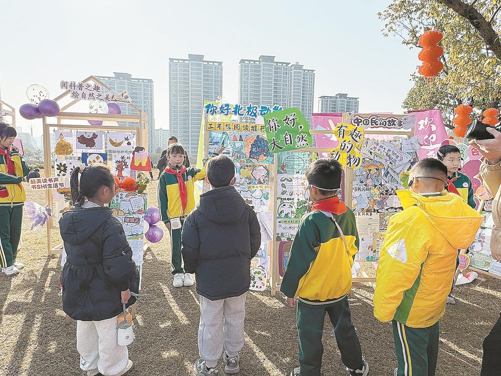 小志愿者在图文展板前讲解各自学校在书香校园建设中的特色阅读成果。