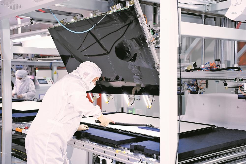 基地的智慧生产车间里,数百米长的自动化产线,仅需少量人员辅助,就能完成整机装配、工艺检查、固件升级、自主调试、整机包装等一系列生产流程,并且能实现从55寸到98寸的不同规格定制化显示产品的灵活切换,有效提升生产质效。