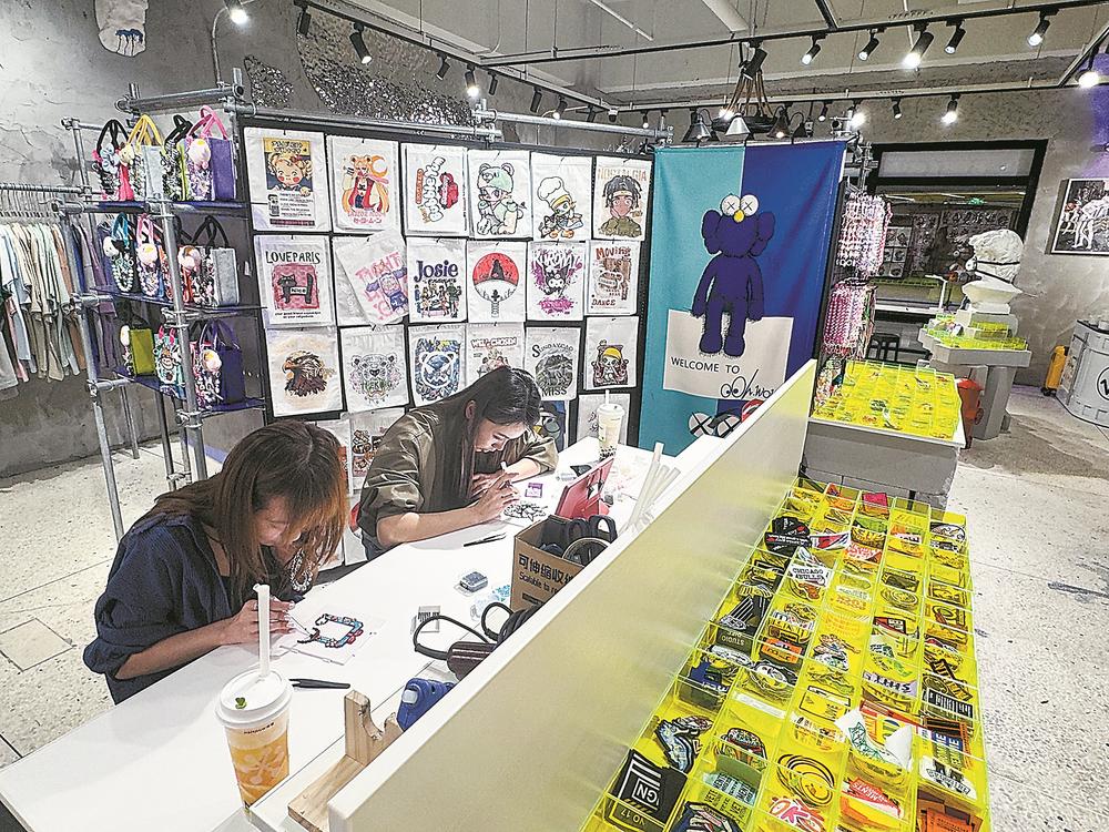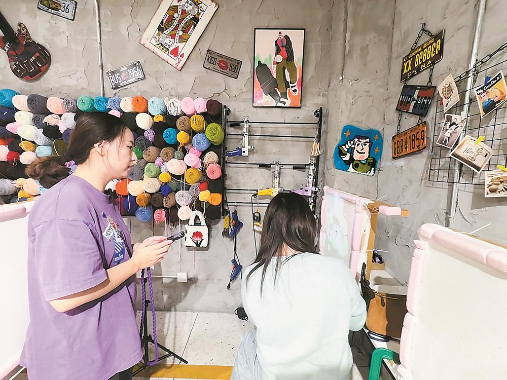 距离五缘湾10公里外的禹悦汇商场,“哦哇服饰DIY艺术研究所”在工作日下午渐渐热闹起来。店内的墙上挂满手绘T恤、贴布帆布包、缀着金属链的毛线帽,各类零碎的贴布、装饰贴画分门别类,在店内罗列成规整的坐标格。毕业于服装设计专业的店主田玲珑正弯腰指导客人如何在Tufting地毯上用马克笔描出图案的边。