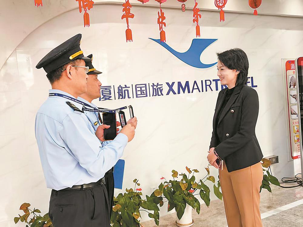 执法人员向厦门航空国际旅行社相关负责人出示证件,依法开展行政检查。