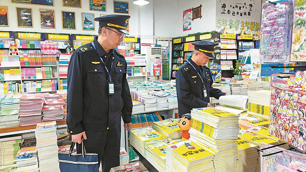执法人员对校园周边书店经营的教辅教材进行检查。