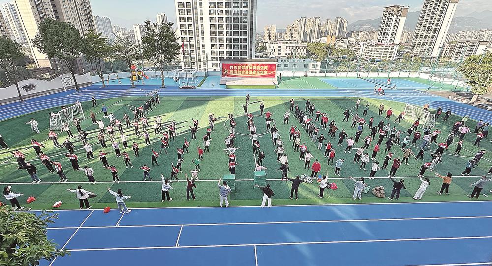 学生进行大课间跳操运动。
