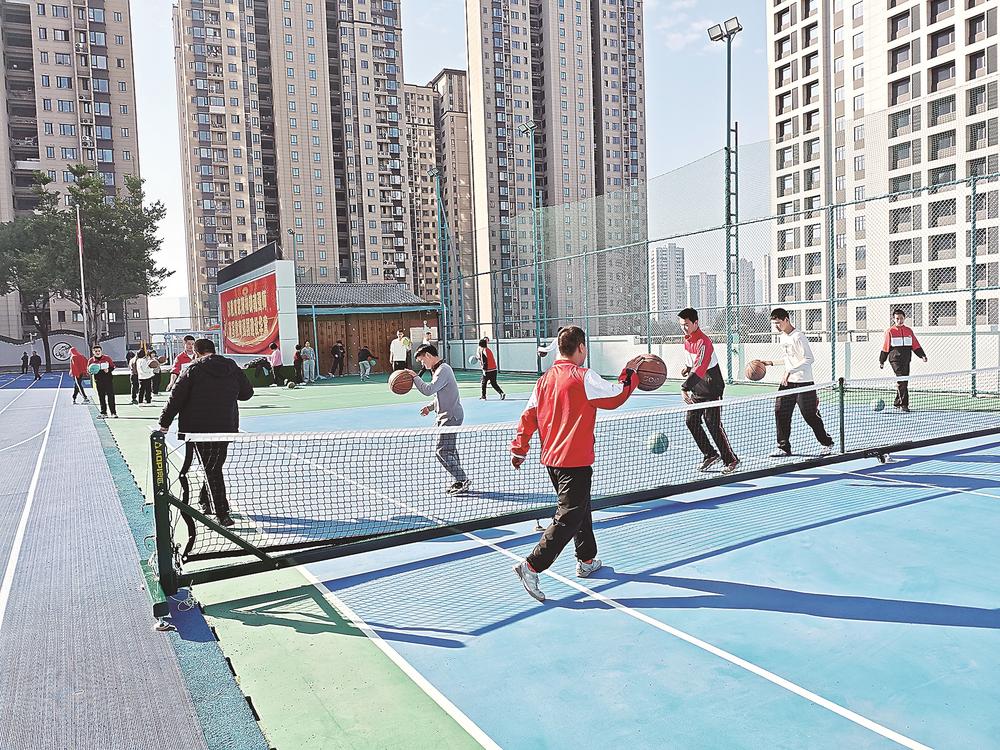 学生在操场进行拍球训练。