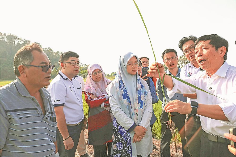 林文雄(右一)在马来西亚指导再生稻种植关键技术。通讯员 范巧红 摄
