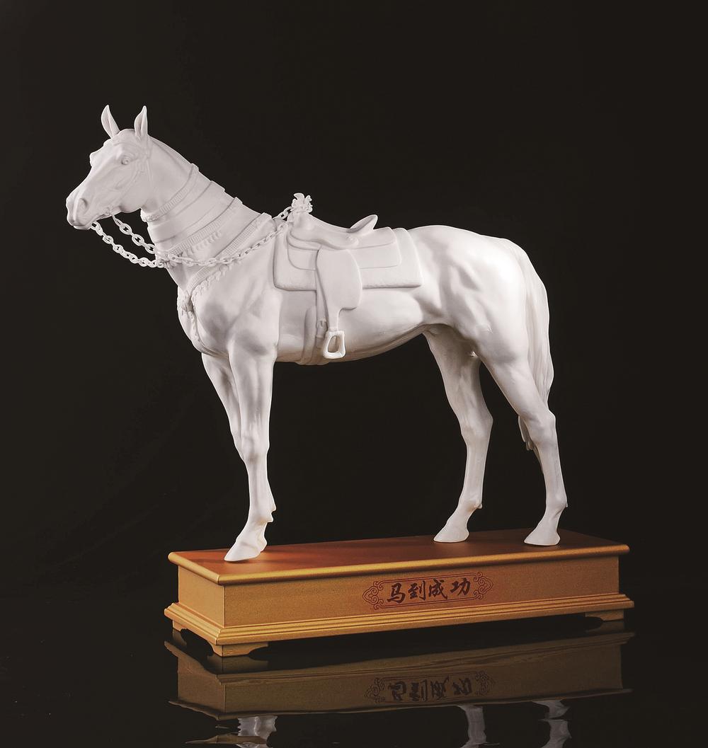 在福建省工艺美术大师蔡国海的工作室里,数十款陶瓷骏马姿态各异,或蓄势奔腾,或昂首嘶鸣。其中,白瓷作品“马到成功”尤为吸睛。该作品采用写实风格,以汗血宝马为原型,釉色莹润如玉,肌骨线条遒劲,鬃毛似随风舞动,生动展现出力量与速度的美感。