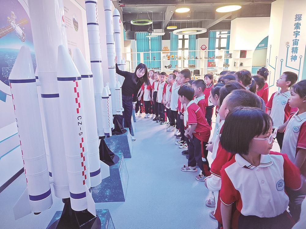 理念的落地,首先体现在校园环境的全方位重塑。学校围绕“让校园成为科学探索乐园”的目标,打造了“三维立体”的科学教育空间。走进校园,航天文化墙生动展示着中国航天事业的历程,无声地滋养着孩子们的探索志向;智慧阅读科技馆中,航天、生态、工程等领域的科普书籍触手可及,每月举办的“科学读书会”已成为传统;楼道里、开放式书吧中,随处可见的学生科技作品与“航天科普专区”相映成趣,“十分钟课间科学阅读”让探索的氛围弥散在日常之间。通过每一面墙、每一个角落,学校让“问天”精神可视、可感,浸润孩子成长的每一步。