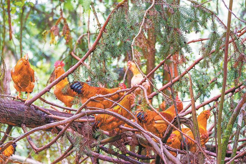 “一天就喂这一顿‘杂粮饭’,剩下的得让它们自己找食。”连桂兴边说边打开鸡舍,鸡群扑棱着翅膀奔向后山。这片山林,是它们的“撒欢地”。武平县森林覆盖率达79.7%,象洞鸡沐浴在富含负氧离子的空气中,奔跑在广袤的山林里,以野果为食,以山泉为饮。“它们凶得很,有时候天黑了都不回鸡舍,直接上树过夜。”连桂兴笑着指向树梢,几只公鸡正蹲在枝丫上梳理羽毛。