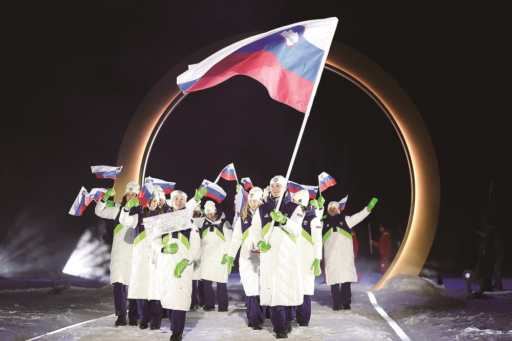 斯洛文尼亚体育代表团身着匹克体育生产的运动装备参加米兰冬奥会开幕式。(新华社)