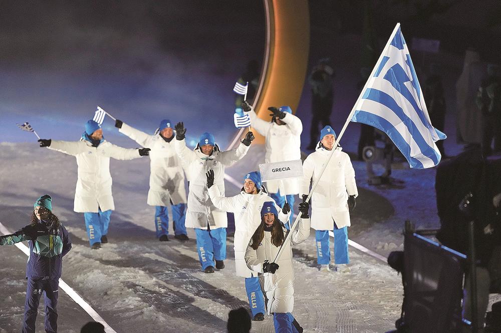 希腊体育代表团亮相米兰冬奥会开幕式。在本次冰雪盛会上,安踏体育为希腊体育代表团提供全套领奖装备与生活装备。(新华社)