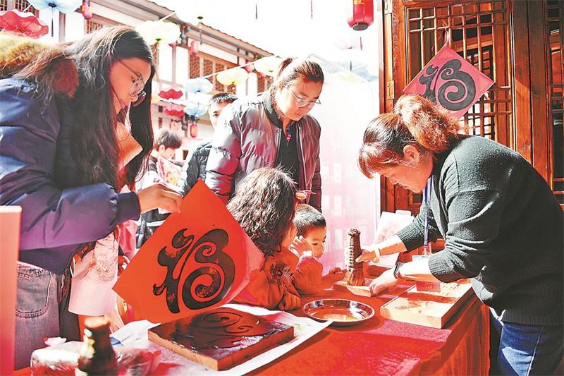 小朋友体验木刻印刷“福”字。通讯员 王英德 见习记者 李子衡 摄