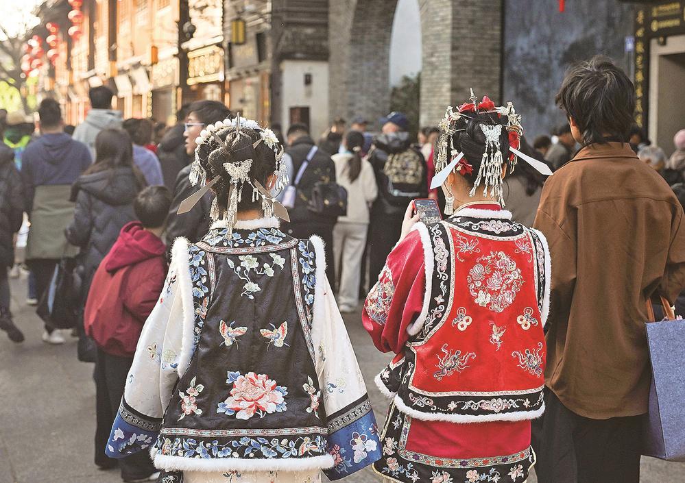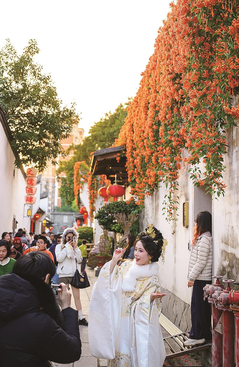 立春,漫步于承载着福州商业发展历史记忆的上下杭街区,但见星安桥上年轻人头戴“三条簪”、身着汉服打卡拍照,桥下游人泛舟而过,不远处福州茶馆里飘出淡淡的茉莉花茶香,古琴演奏者在茶馆的阳台轻揉慢捻。移步换景,宛如“一秒穿越”。