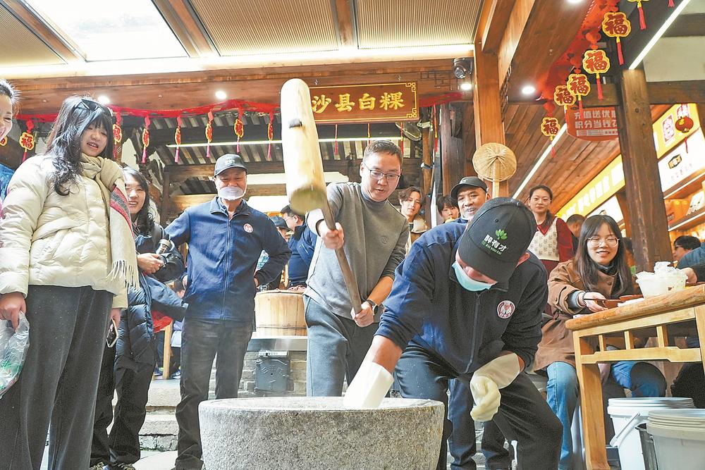 如今,这份凝聚着家族情感的“年味”正随着时代春风悄然蔓延至更广阔的天地——春节期间,沙县东门古街游人如织,在醉有才大食堂,“打白粿”“捶扁肉”体验区排起了长队。来自天南海北的游客好奇地举起木槌,尝试捶打石臼中的米团;孩子们则用力按压着模具,制作属于自己的“福”字白粿。“咚咚咚”的捶打声与欢声笑语交织,传统技艺摇身一变,成了可体验、可共享的文化景观。