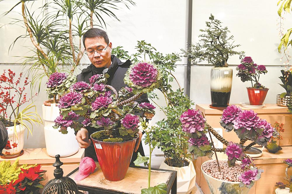 前年春节,章辉入手了两盆网红单品——“禁止蕉绿”和“动感光菠”。凭借好创意与好彩头,香蕉与菠萝两大热带水果变身居家绿植,成为龙年爆款。马年花市,类似“脑洞大开”的产品同样层出不穷。最让章辉称奇的是一款名为“冬日玫瑰”的盆栽。看似玫瑰,其实它是一盆菜——我们熟悉的十字花科蔬菜紫甘蓝,经过多年培养茎部逐渐木质化,变身具有观赏价值的老桩盆栽。