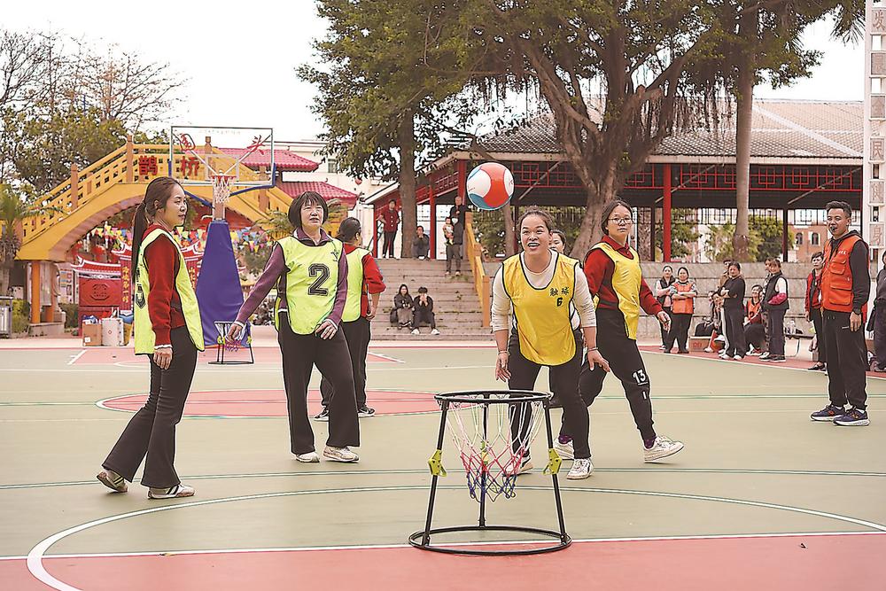 两岸姐妹参与定点投筐比赛。