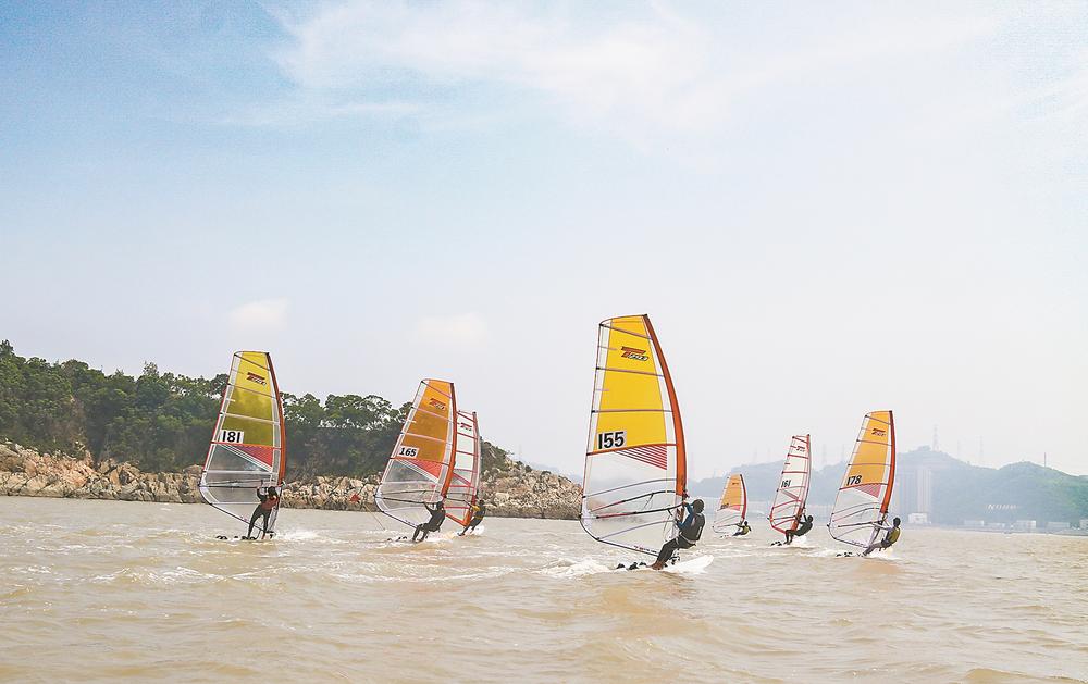 由不同学校的学生组成的福鼎市帆船帆板队在硖门畲族乡青湾村白沙沙滩集训。