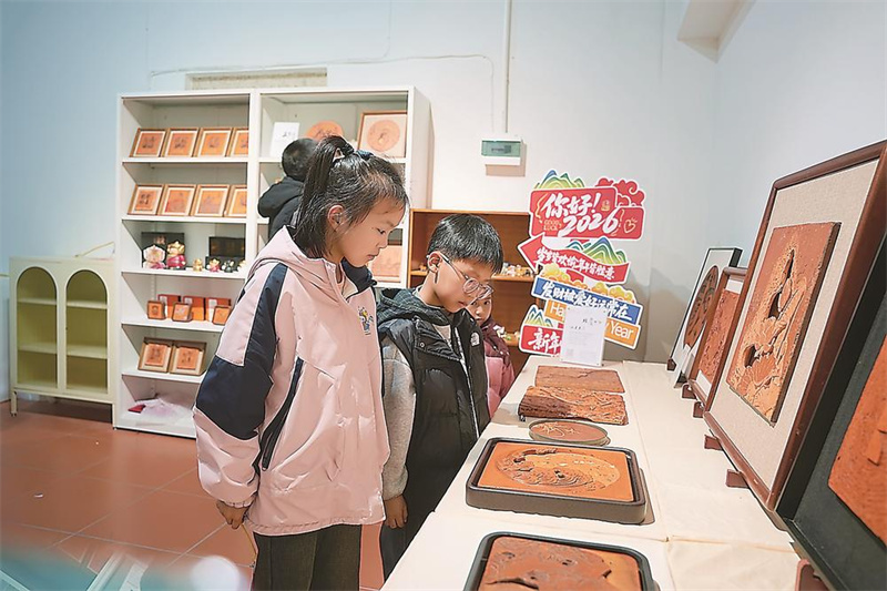 小朋友在欣赏石井顶街的砖雕文创作品。