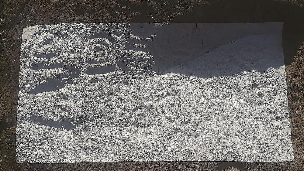在这块灰褐色的岩石上,密密麻麻分布着大量人工凿刻的图案和坑洞,如同远古先民留下的一封“石上书函”。经初步统计,岩刻图案共100余幅,尺寸大小不一,最大的长460毫米、宽270毫米,最小的也有100多毫米见方;另有凿洞500余个,最大的直径约90毫米,深达55毫米。这些凿刻痕迹深浅不一、疏密有致,虽历经数千年风雨侵蚀,依然清晰可辨。