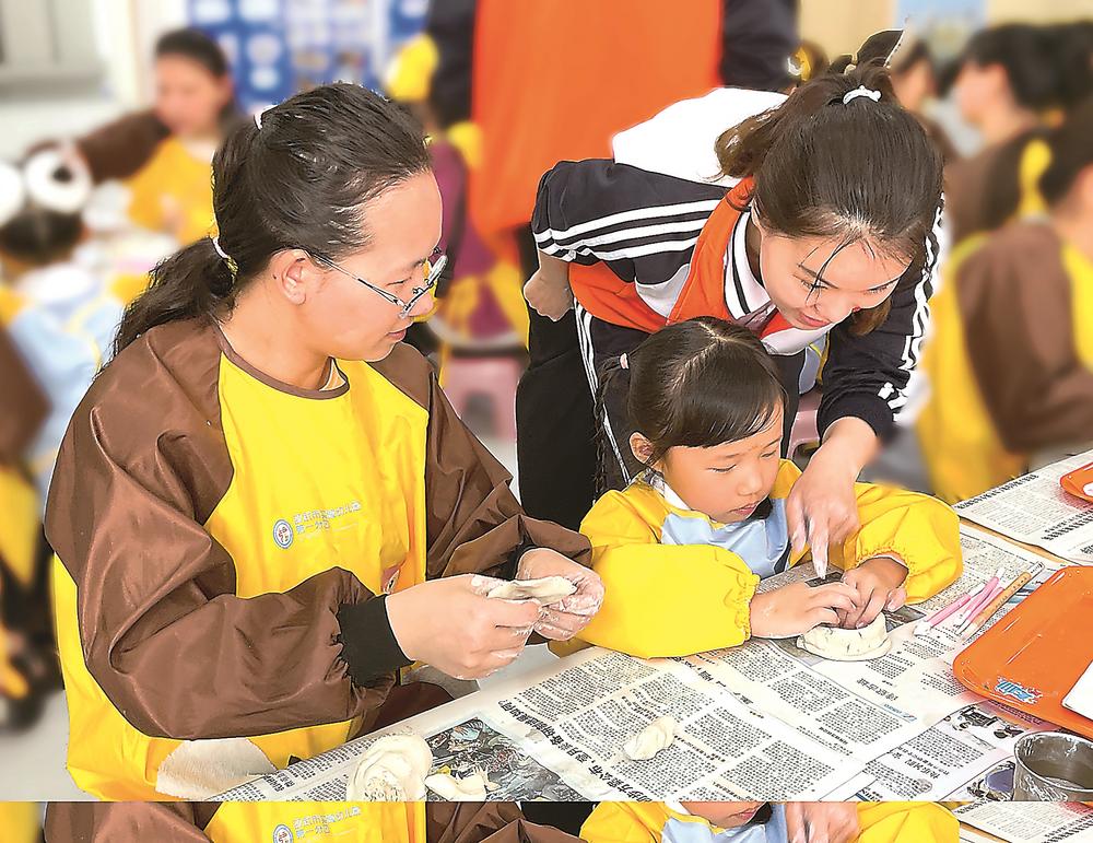 在古城幼儿园,孩子们用画笔描绘城墙,用黏土制作古建模型。