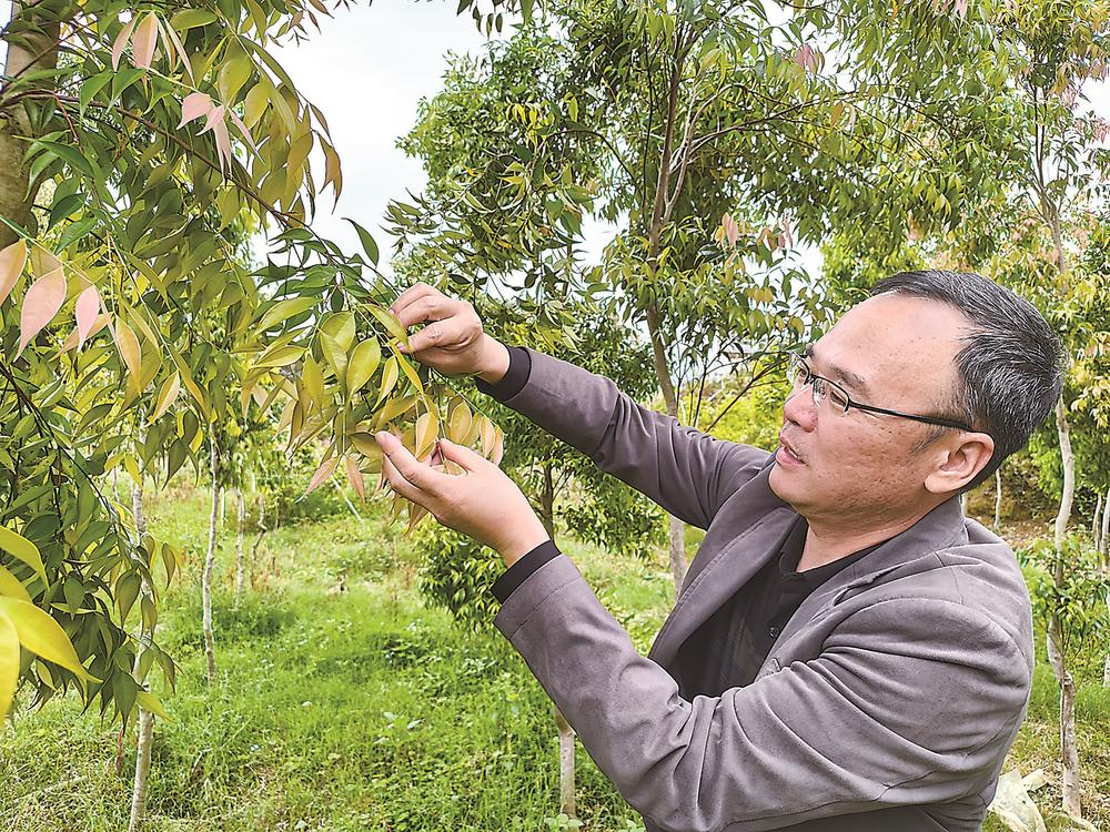 方镇福在云霄县白果蒲桃现代林业产业园检查白果蒲桃叶色表型差异。